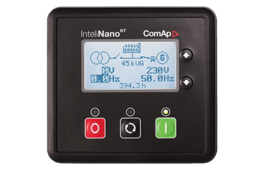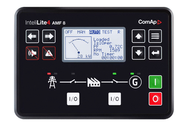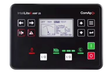 Controlador de grupo electrógeno, con funciones de falla automática de red (AMF) y arranque manual y remoto.